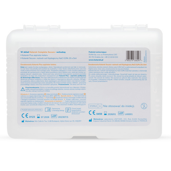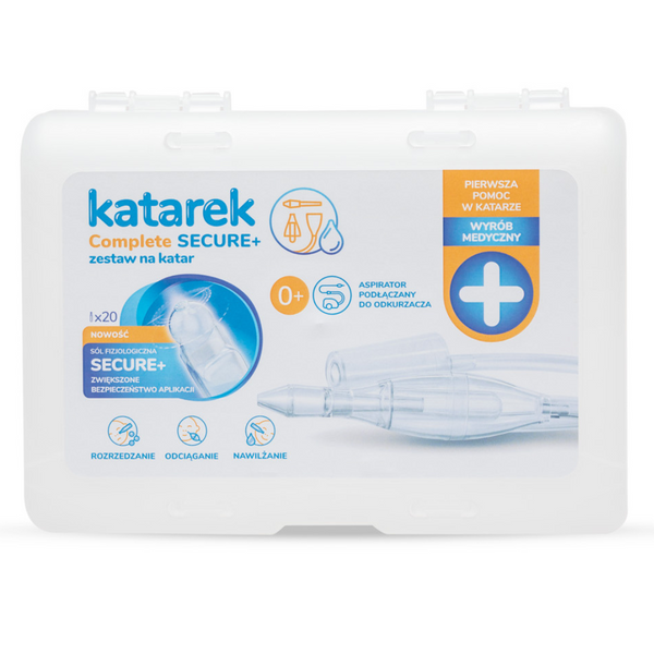 Katarek Complete Secure+ to zestaw na katar, który zawiera aspirator kataru podłączany do domowego odkurzacza, 20 ampułek soli fizjologicznej Katarek Secure+, oraz zestaw akcesoriów a wszystko to zamknięte w wygodnym plastikowym pudełku.