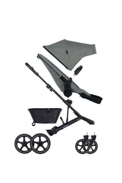 Zestaw spacerowy zawiera: stelaż, siedzisko z budką i pałąk z ekoskóry.