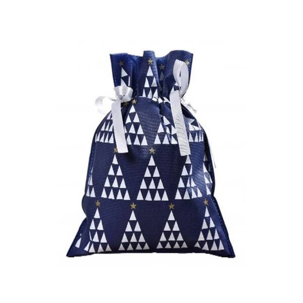 Worek na prezenty w pięknym granatowym kolorze z ozdobnymi, geometrycznymi wzorami choinek. Rozmiar 60x90 cm.
