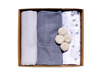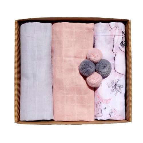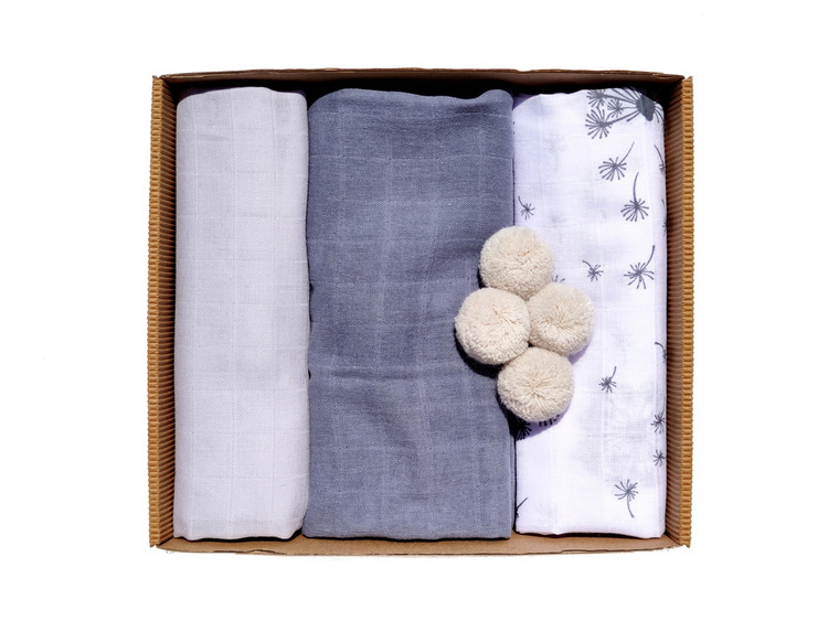 Komplet trzech miękkich i przewiewnych pieluszek muślinowych. W skład każdego kompletu wchodzą 2 klasyczne pieluszki i jedna pieluszka wykońcona w każdym rogu pomponikiem. Zestaw zapakowany jest w kartonik, idealnie sprawdzi się w roli prezentu.