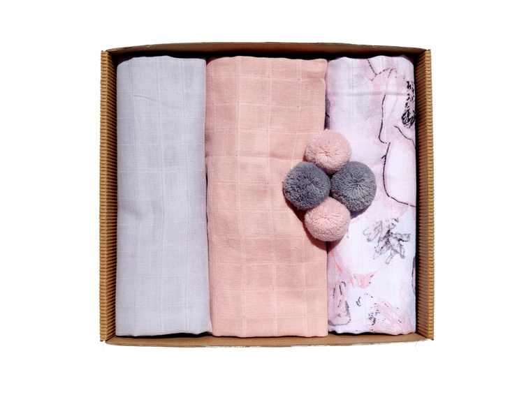 Komplet trzech miękkich i przewiewnych pieluszek muślinowych. W skład każdego kompletu wchodzą 2 klasyczne pieluszki i jedna pieluszka wykońcona w każdym rogu pomponikiem. Zestaw zapakowany jest w kartonik, idealnie sprawdzi się w roli prezentu.