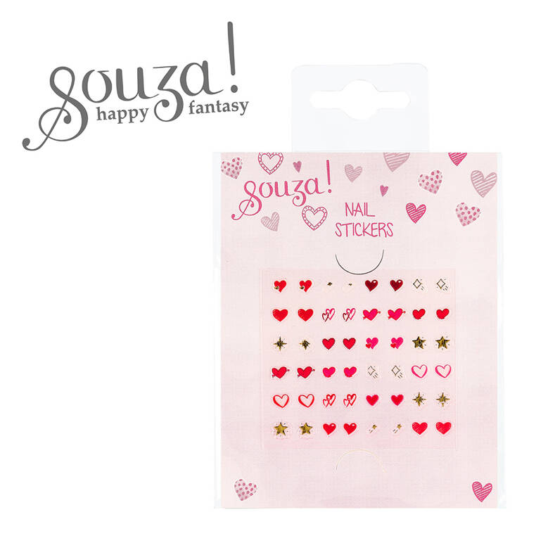 Zestaw naklejek na paznokcie Serduszka holenderskiej marki Souza! W jego skład wchodzi 48 sztuk (24 pary) drobnych kształtów, m. in. serc, gwiazd i komet w odcieniach różu, czerwieni i złota. Naklejki są nietoksyczne, nie podrażniają skóry, ani płytki paznokcia. Łatwo od niej odchodzą. Samoprzylepne ozdoby to bezinwazyjny i bezpieczny wybór dla dzieci zamiast tradycyjnych ozdób. Ponadto dzięki wielu elementom zestaw szybko się nie znudzi. Sprawdzi się także jako stylowy prezent.