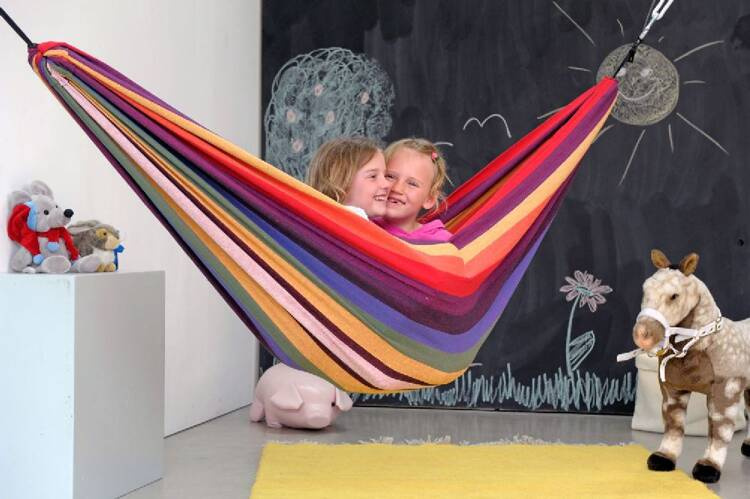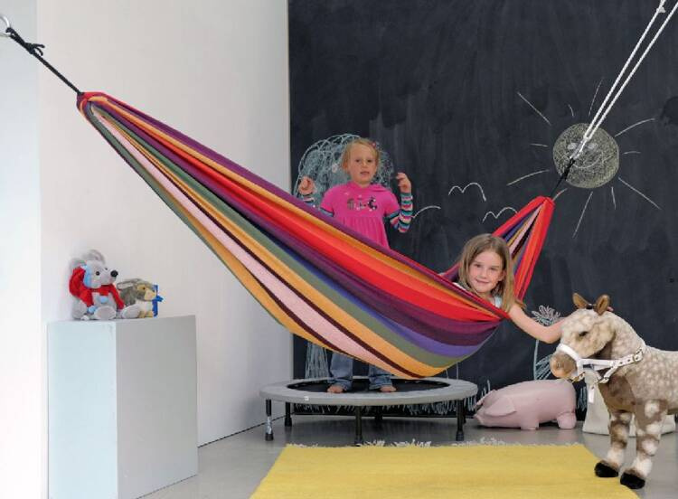 Szczęśliwym efektem ubocznym jest to, że kołysanie rozwija poczucie równowagi u dzieci, dlatego hamaki są powszechnie stosowane w terapii dziecka. To oryginalny, kolorowy hamak brazylijski dostępny w specjalnym rozmiarze dla dzieci, mieści się w każdym pokoju dziecka i może być montowany na kilka sposobów, w różnych miejscach (po dokupieniu wybranych akcesoriów do zawieszenia hamaka):