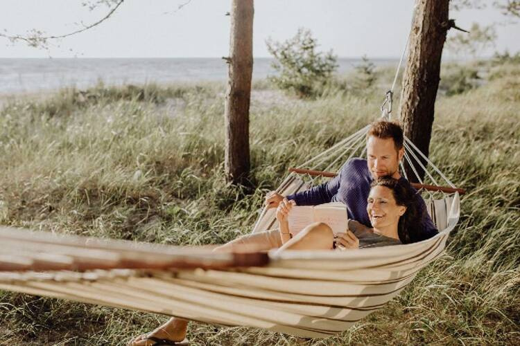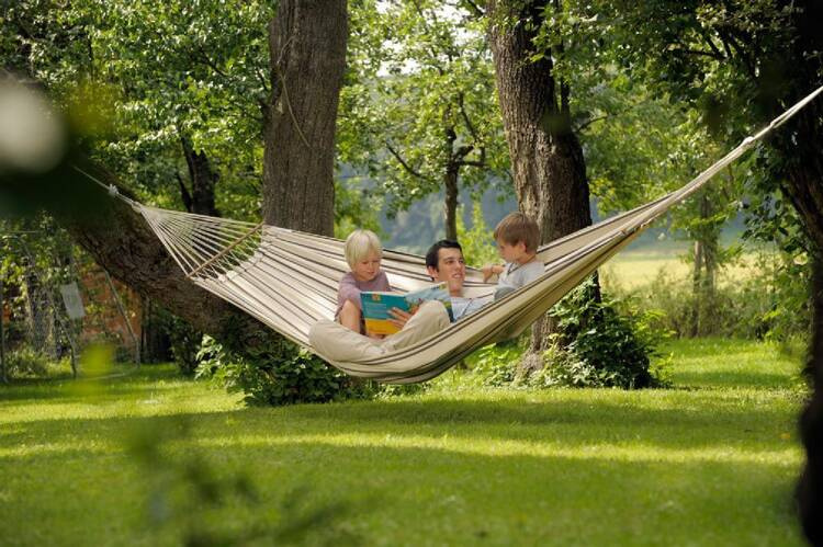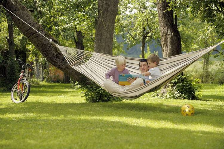 Osiągnęliśmy to poprzez użycie nadzwyczaj elastycznego i miłego splotu w wysokiej jakości (350 g/m2) oraz projektując hamak tak, że materiał jest szerszy od poprzeczek: materiał ma 140 cm, poprzeczki: po 100 cm. Dzięki temu w trakcie leżenia tworzy się z materiału "łuk”, w którym wygodnie i bezpiecznie można się ułożyć i relaksować.