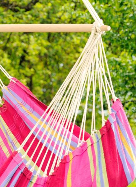 Ten fotel hamakowy tkany w Brazylii jest cudownie miły dzięki bardzo wysokiej zawartości bawełny w składzie: 85% bawełny i 15% poliestru.