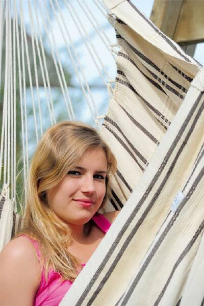 Ten fotel hamakowy tkany w Brazylii jest cudownie miły dzięki bardzo wysokiej zawartości bawełny w składzie: 85% bawełny i 15% poliestru.