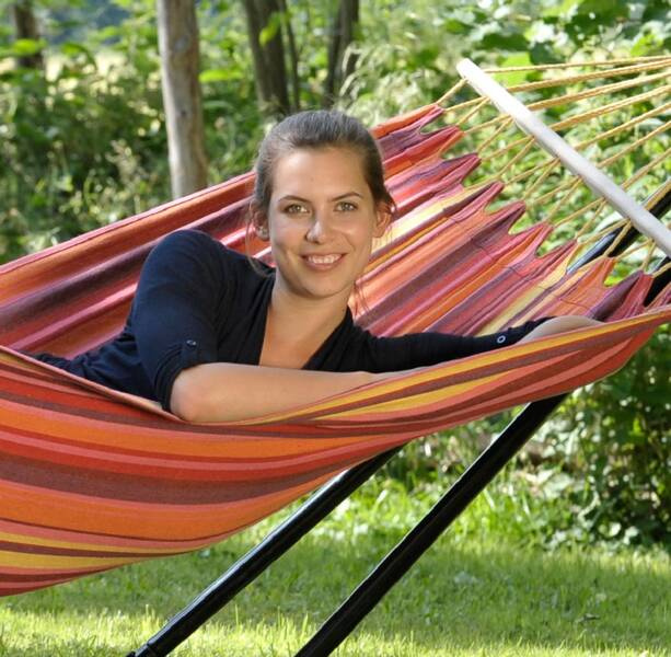 Beach set to jednoosobowy hamak w kolorze Vulcano wraz z dedykowanym stelażem i łańcuchami. Świetny nie tylko na plażę, ale także do ogrodu, na działkę, poręczny także w podróży.
