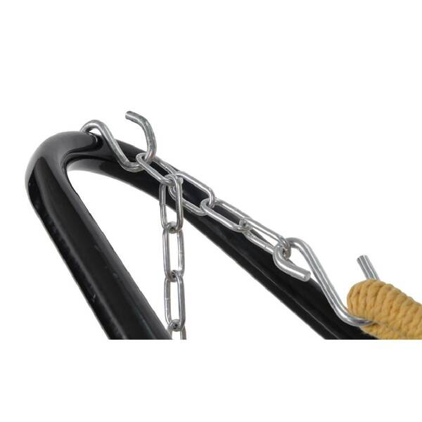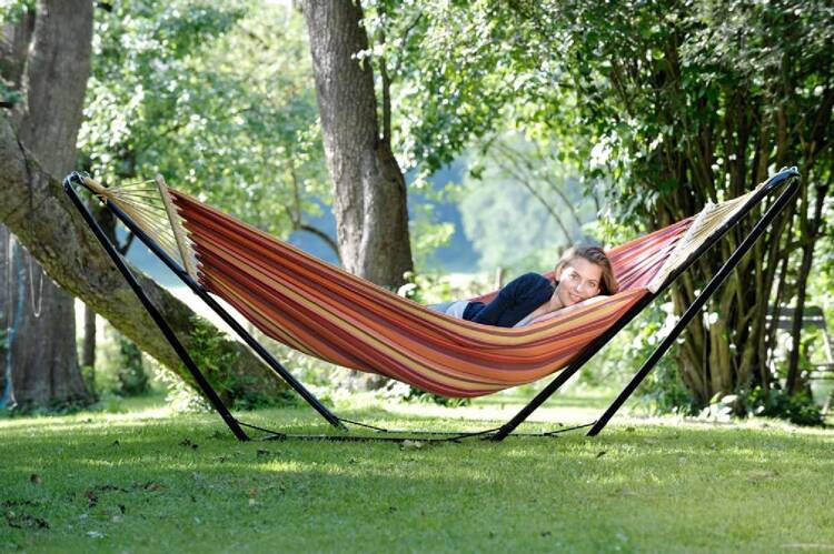 Zestaw zawiera: hamak, stelaż i łańcuchy do powieszenia.