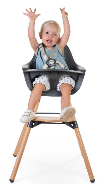 Evolu to designerskie i zarazem funkcjonalne krzesełko do karmienia, które dostosowuje się do trzech wysokości blatów: do ławy lub stoliczka dziecięcego o wysokości około 50 cm, do regularnego stołu o wysokości 75 cm oraz odpowiednie jest do wyspy kuchennej o wysokości blatu 90 cm (po dokupieniu podwyższenia - dodatkowych nóżek). Siedzisko wykonane z pracującego plastiku jest szerokie i bardzo wygodne. Krzesełko posiada 5-stopniowe pasy bezpieczeństwa. Zalecane jest dla dzieci od 6 miesiąca do 6 roku życia.
