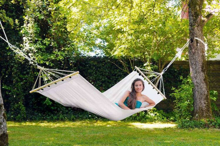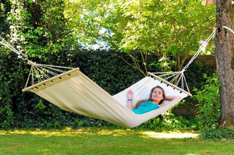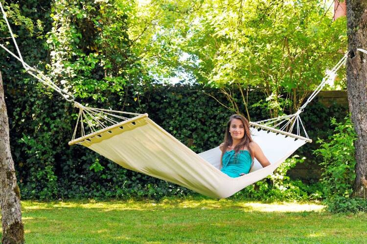 Hamak z poprzeczkami, wygodny i wytrzymały. Świetnie sprawdzi się na kempingu, na działce, w ogrodzie jak i domu. Wykonany z tkaniny Elltex odpornej na warunki atmosferyczne i promienie UV.