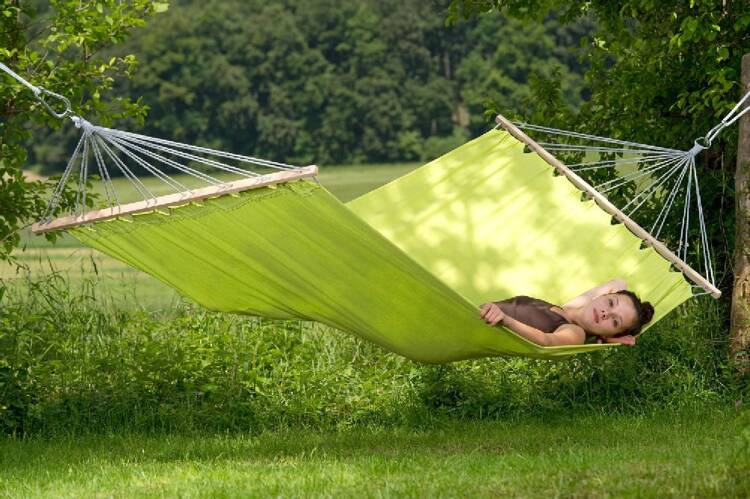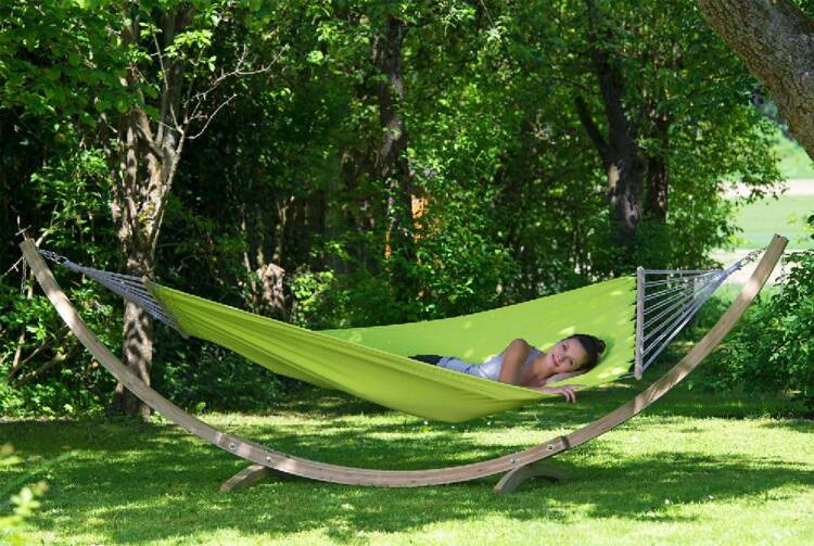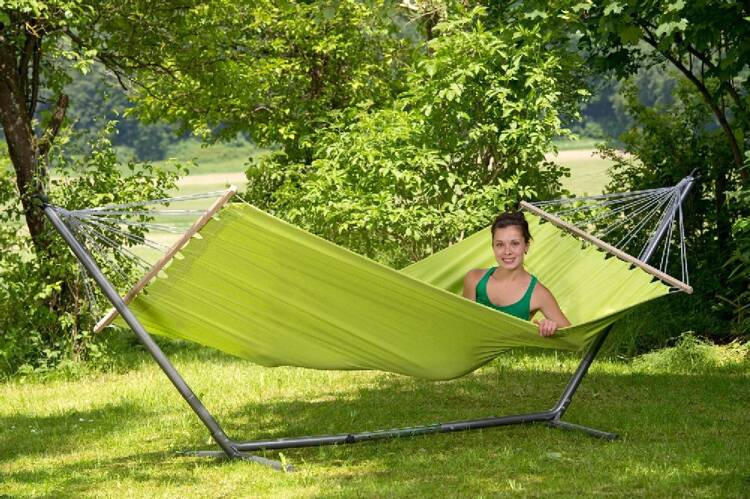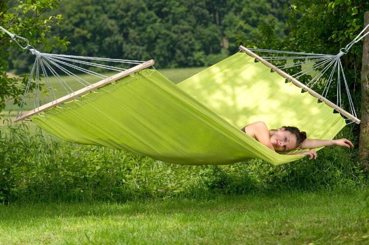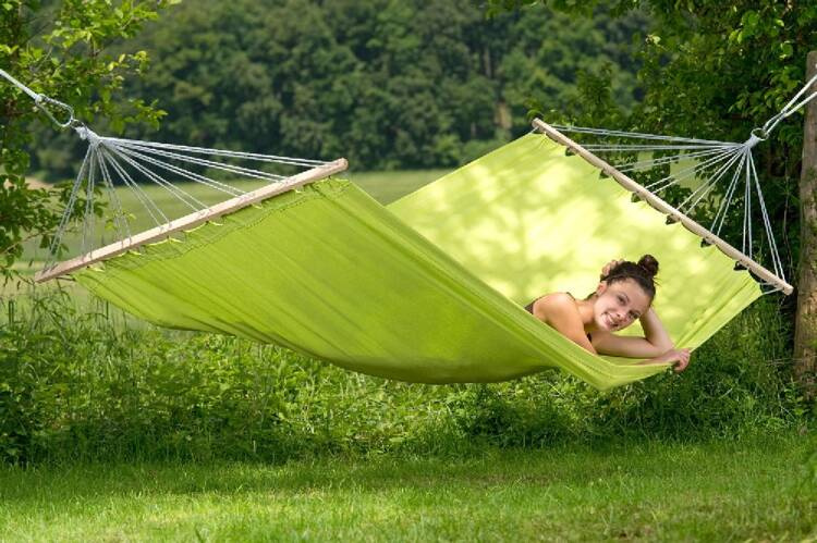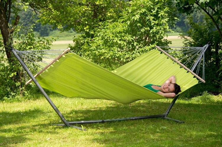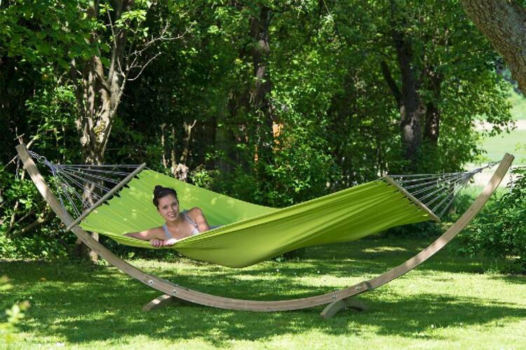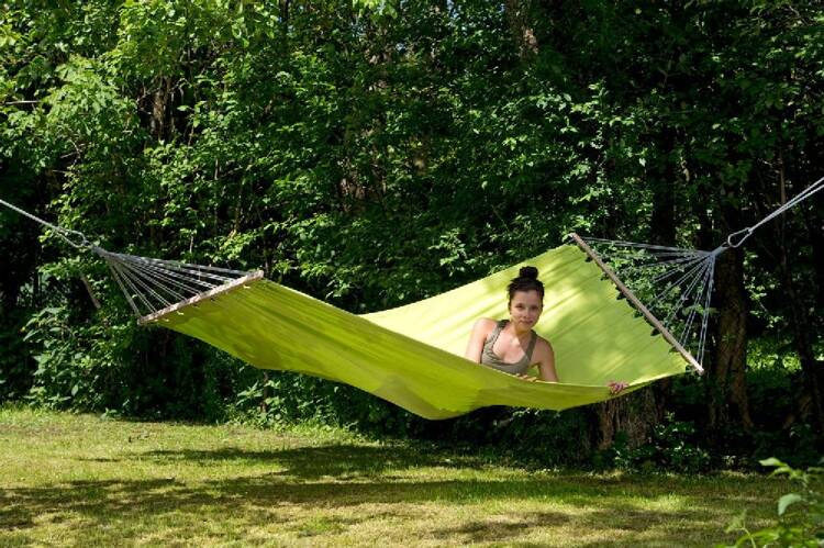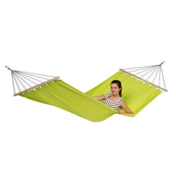Duży hamak, zakończony z obu stron drążkami usztywniającymi. Hamak jest bardzo wygodny, wykonany został z 80% recyklingowanej bawełny oraz 15% poliestru.