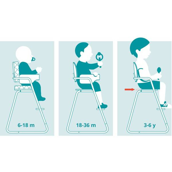 - Dwie pozycje siedzące oraz trzy wysokości podnóżka, aby dostosować krzesełko do potrzeb dziecka