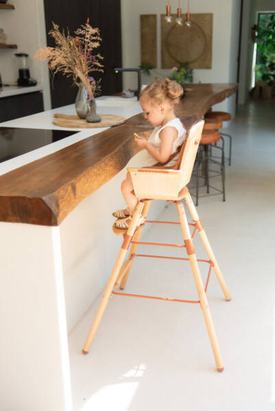 Evowood pasuje do regularnego stołu o wysokości 75 cm, z możliwością podwyższenia wysokości za pomocą dodatkowych nóg, dostosowujących krzesełko do wyspy kuchennej o wysokości 90 cm.