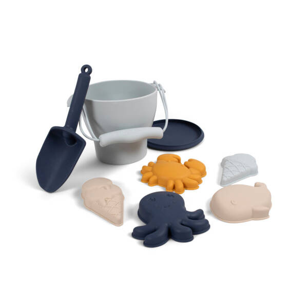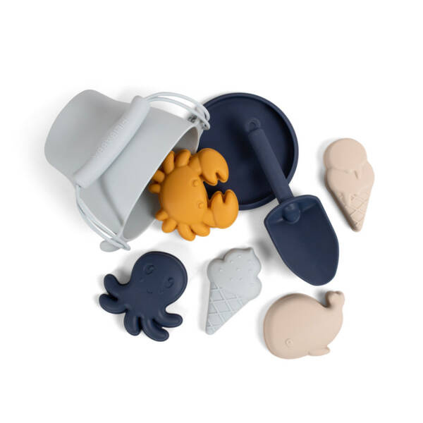 Zestaw zabawek do piasku w wiaderku został wykonany z miękkiego i bardzo trwałego silikonu, w 100% wolnego od BPA.