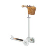 Szeroki i wygodny dębowy podest z czarną gumową taśmą griptape, Gumowe uchwyty na kierownicy, spód z aluminium z logo Banwood, wiklinowy kosz