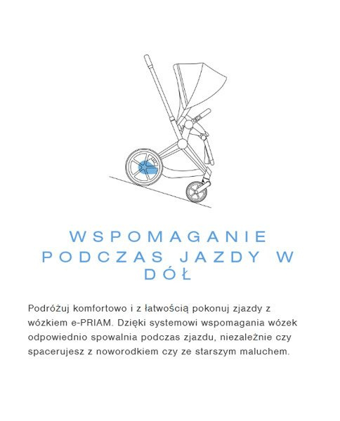 Cybex e-Priam to absolutna nowość wśród wózków ! To pierwszy inteligentny wózek na świecie ! Elektryczny Priam wspomaga rodziców podczas spacerów, na nierównych nawierzchniach, pod górkę oraz z górki. Wszystko obsługiwane stopą-nie musisz się schylać, szukać przycisków, obsługa jest niezwykle prosta i intuicyjna. Design został zachowany jak w przypadku standardowego Priama, więc wózek nadal zachwyca swym pięknym wyglądem, a teraz też i innowacyjnością !