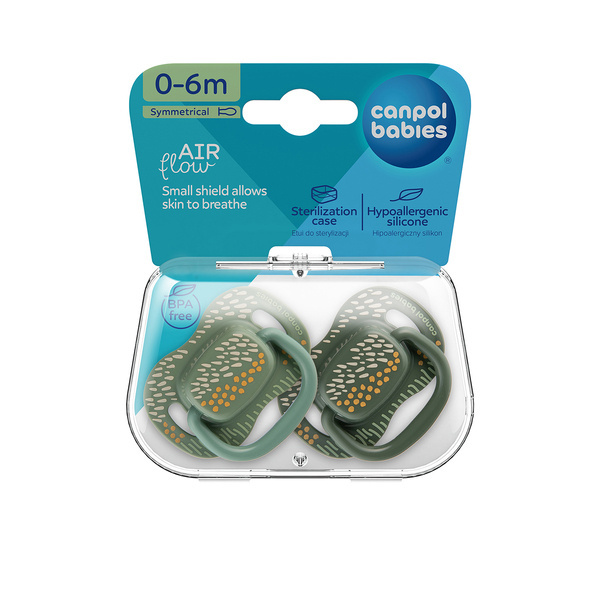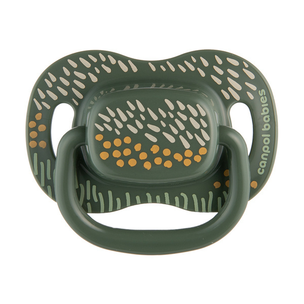 Smoczek jest bezpieczny i łatwy do utrzymania w czystości, dzięki nowoczesnemu etui, które może służyć zarówno do przechowywania, ale też do szybkiej i wygodnej sterylizacji w kuchence mikrofalowej. Wystarczy odrobina wody i 2 minuty, aby zapewnić smoczkom higieniczną czystość. W produkcji nie stosowano BPA ani innych szkodliwych substancji. Smoczek silikonowy Canpol babies symetryczny jest rekomendowany dla dzieci w wieku 0-6 miesięcy. Smoczek symetryczny Canpol babies 0-6m Mountains jest dostępny w dwóch wersjach kolorystycznych i różnych rozmiarach – rośnie razem z Twoim Maluszkiem.