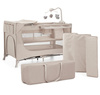 • W skład zestawu wchodzi karuzela z dźwiękiem, światełkami i 3 zabawkami, torba do przenoszenia, przewijak, organizer, podwieszana podłoga z wypenieniem zastępująca materac