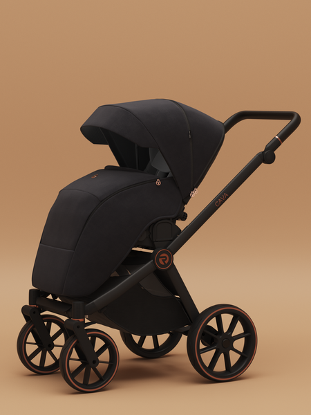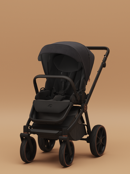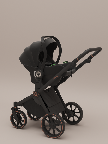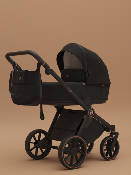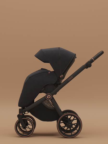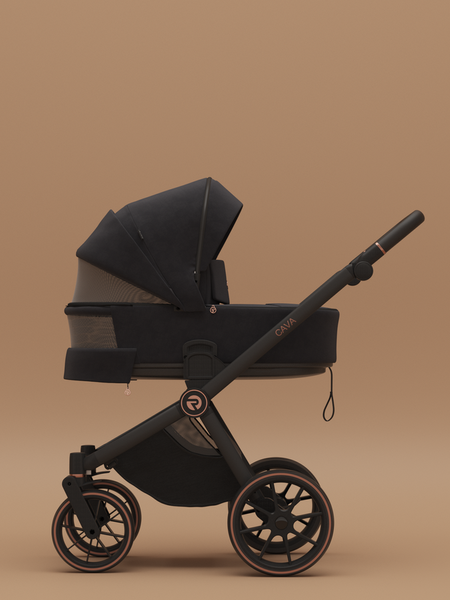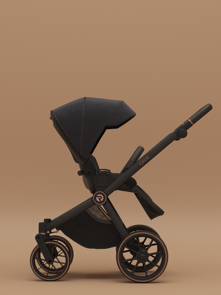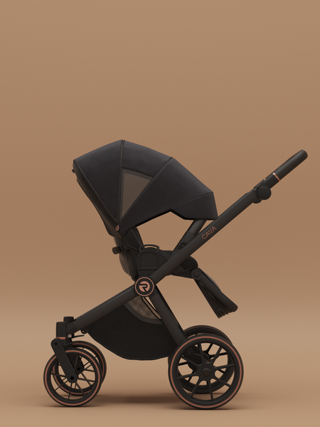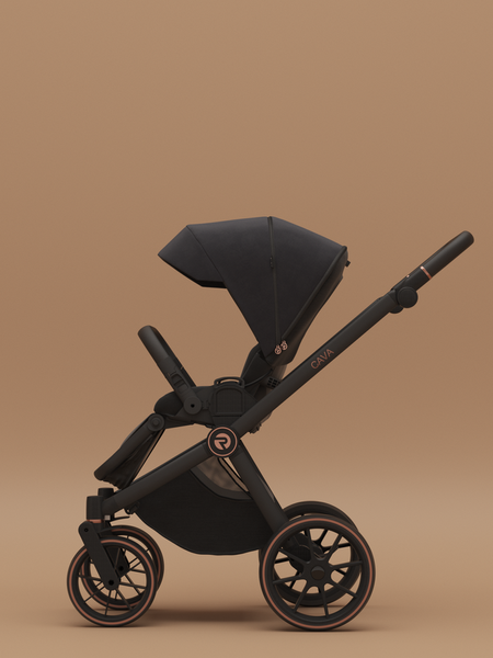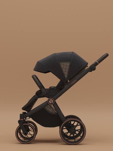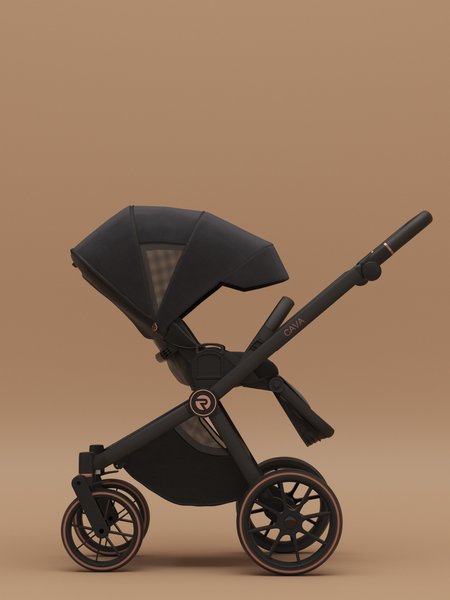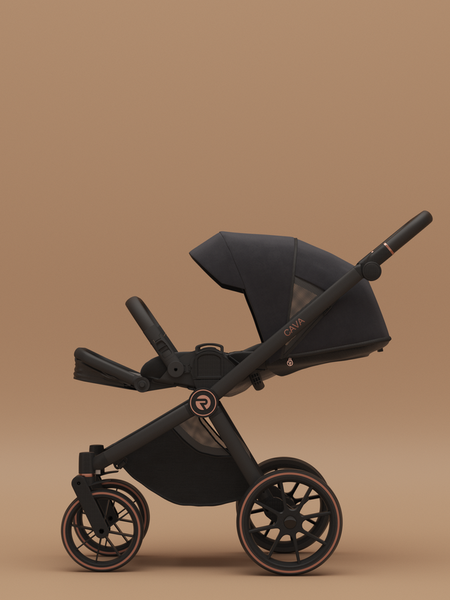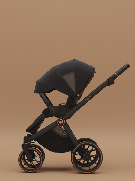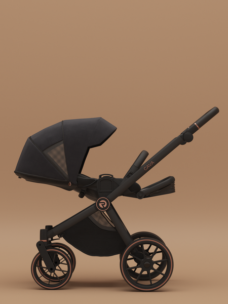 Model CAVA dostępny jest w 2 liniach kolorystycznych: COPPER z elementami wykończeniowymi w kolorze różowego złota i czarnym stelażem oraz CHAMPAGNE z czarnymi matowymi wykończeniami w połączeniu z anodyzowanym szampańskim kolorem stelaża. Zewnętrzne elementy tapicerki uszyte zostały z modnej tkaniny 3D (plaster miodu) z impregnacją zapewniającą spływanie wody oraz filtrem UV50+ chroniącym Twoje dziecko przed szkodliwym promieniowaniem i utrwalającym kolor tkaniny.