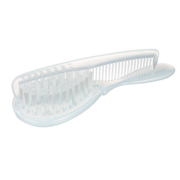 Szczotka do włosów z grzebykiem do codziennej pielęgnacji włosów dziecka. Grzebień posiada zaokrąglone ząbki, które nie podrażniają wrażliwej skóry malucha. Szczotka z twardym, sztucznym włosiem delikatnie masuje główkę dziecka, nie elektryzując włosów. Zestaw dostępny w kilku wariantach kolorystycznych.
