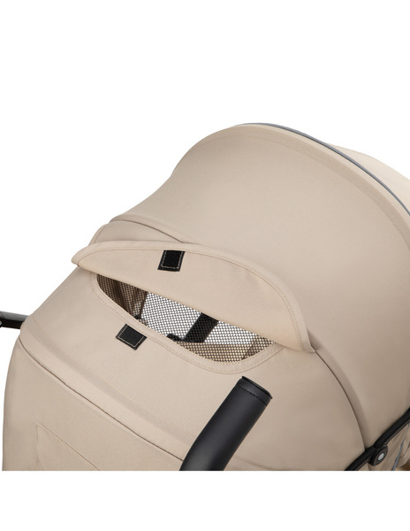 Wózek MoMi AKIRA w tylnej części posiada przewiewną siateczkę, która umożliwi Tobie patrzenie na Twoją pociechę, gdy Ta leży lub śpi, bez konieczności obracania wózka.