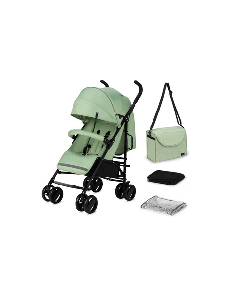 Wózek spacerowy MoMi AKIRA wyposażony jest w mnóstwo dodatkowych akcesoriów: pojemną torbę, moskitierę oraz folię przeciwdeszczową.