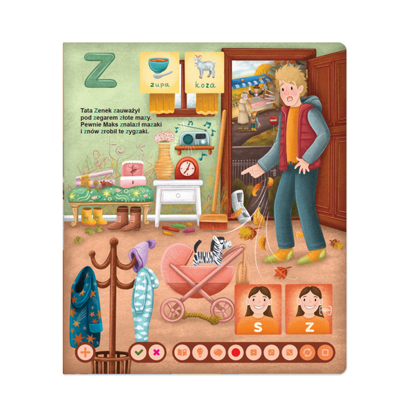 Obejmuje liczne ćwiczenia słuchowe, sylabowe i głoskowe. Informacje rozszerzone, ukryte pod ikoną żarówki, czytane są przez autorkę tekstu, neurologopedkę Urszulę Petrycką-Frugę. Książka zawiera także wydzielone wskazówki dla opiekunów.