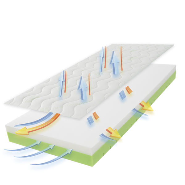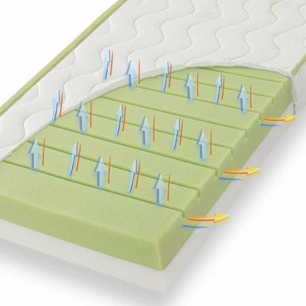 Poprzeczne i wzdłużne kanały wentylacyjne oraz wielopunktowe podparcie pleców zapewniają doskonałą cyrkulację powietrza oraz niepowtarzalny komfort snu podczas wypoczynku.