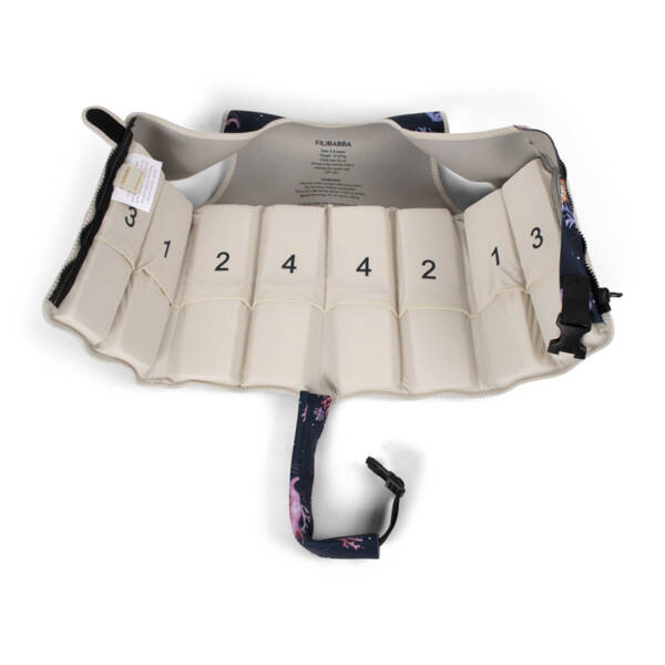 • Oswajanie z wodą i nauka pływania nigdy nie były tak przyjemne ! Kamizelka pozwala na nabranie u dziecka pewności siebie, zachęca do pluskania i beztroskich zabaw w wodzie, daje poczucie bezpieczeństwa. Dzięki wyjmowanym elementom dopasujesz kamizelkę do