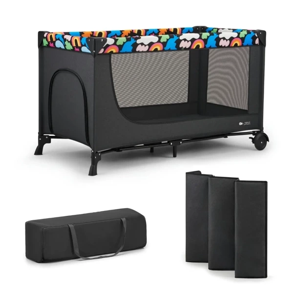 JOY 2 to łóżeczko 2 w 1: pełni funkcję łóżeczka dla starszego dziecka oraz łóżeczka turystycznego. W zestawie znajduje się torba do przenoszenia z praktycznymi uchwytami oraz podłoga z wypełnieniem, a więc nie musisz kupować dodatkowego materaca. JOY 2 można też wykorzystać jako domowy plac zabaw, ma specjalne wyjście z boku, zapinane na zamek.