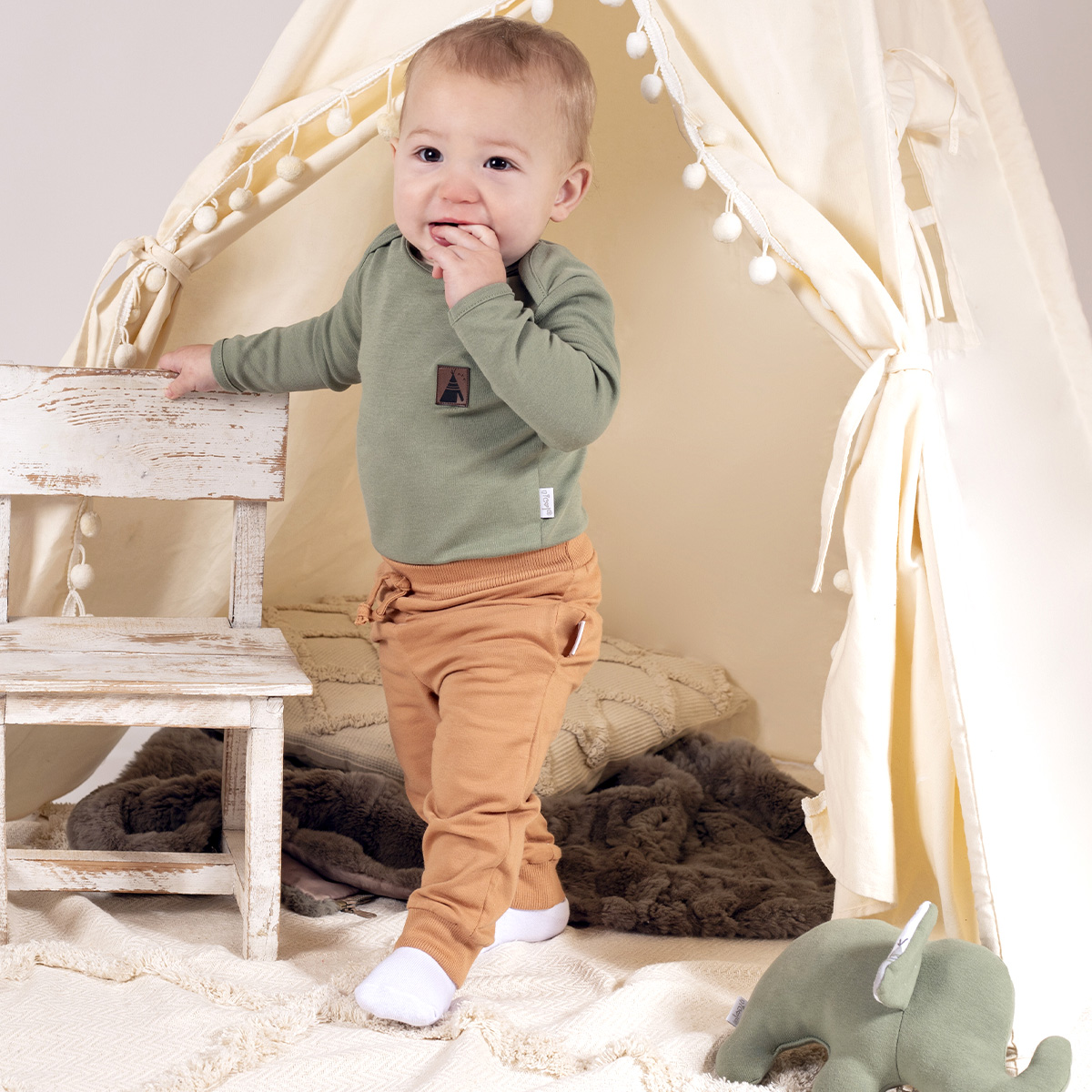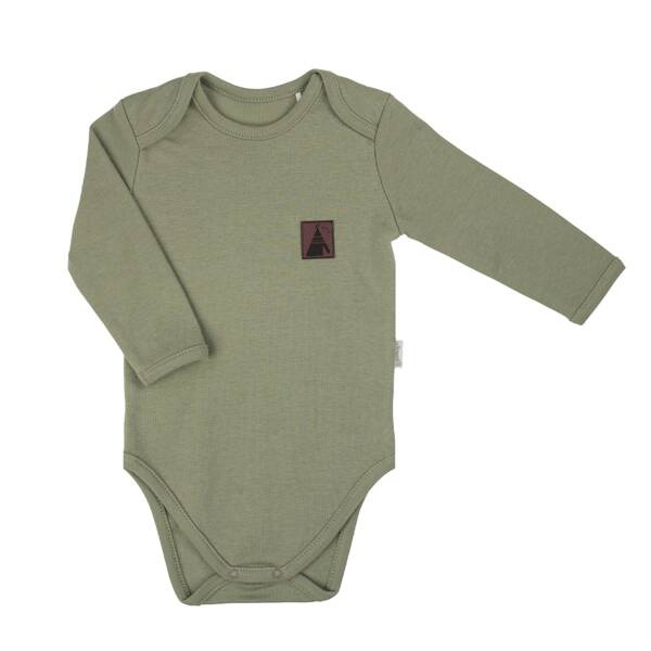 Klasyczne body z długim rękawem dla chłopca. Uszyte z zielonej bawełny, posiadającej certyfikat Oeko-Tex Standard 100 Tekstylia godne zaufania. Body na wygodne zakładki, dodatkowo naszyta naszywka z eco-skórki z namiotem tipi.