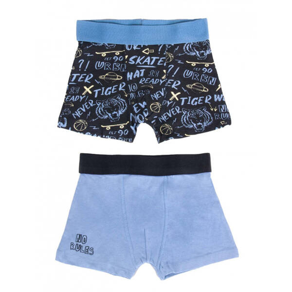 Chłopięce bokserki dostępne w dwupaku, zapakowane w eleganckie pudełko. W ciemniejszych kolorach, z chłopięcymi motywami.