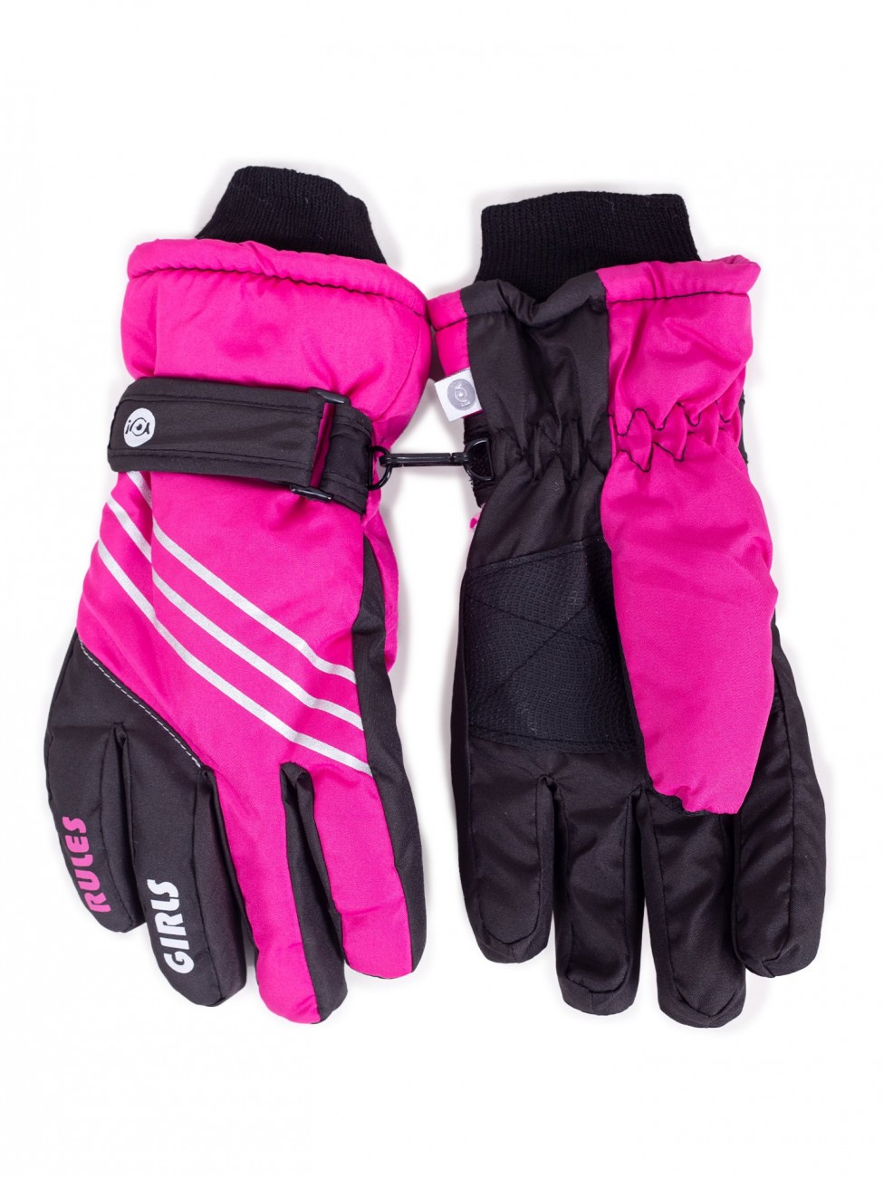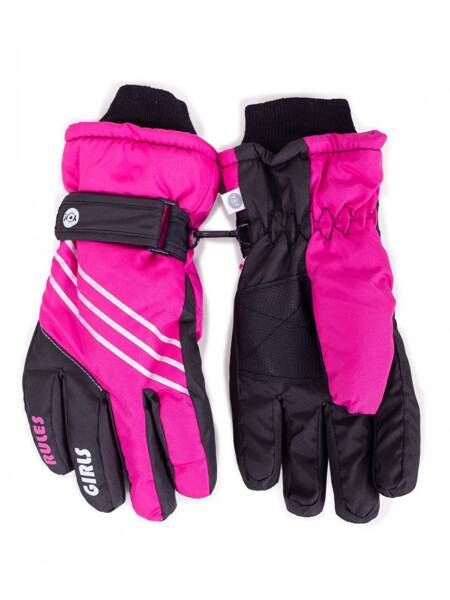 Narciarskie rękawiczki dziewczęce w kolorze różowo – czarnym. Ozdobę stanową trzy srebrne paseczki na zewnętrznej części rękawiczki oraz napis na palcach GIRLS RULES. Wnętrze rękawiczki wykończone miłym polarem.