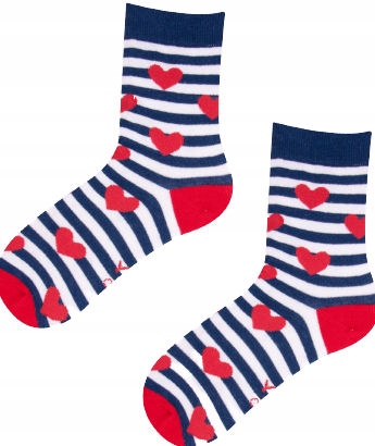 Skarpetki bawełniane zdobione czerwonymi sercami na tle biało granatowych pasków.