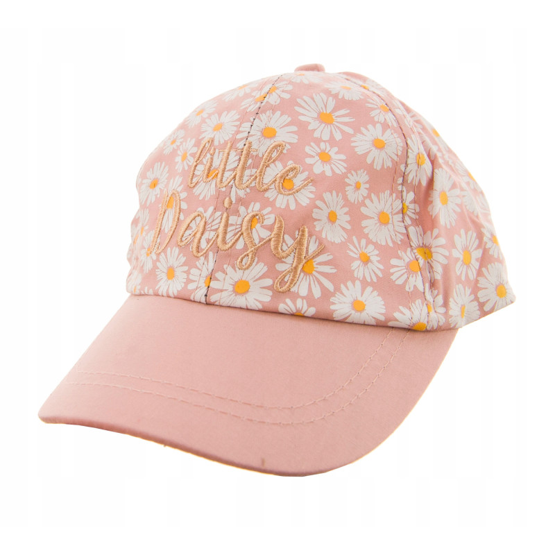 Dziecięca czapka bejsbolówka z motywem stokrotek i z napisem. O klasycznym kroju, z lekko wygiętym daszkiem.