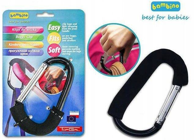 Klips pozwala na szybkie i bezpieczne przypięcie toreb do rączki w wózka. Dzięki miękkiej piance klips nie przemieszcza się i nie rysuje rączki. Przeznaczony jest do przypinania przydatnych rzeczy, a nie obszernych lub ciężkich przedmiotów. Uniwersalny rozmiar pasuje do wszystkich wózków.