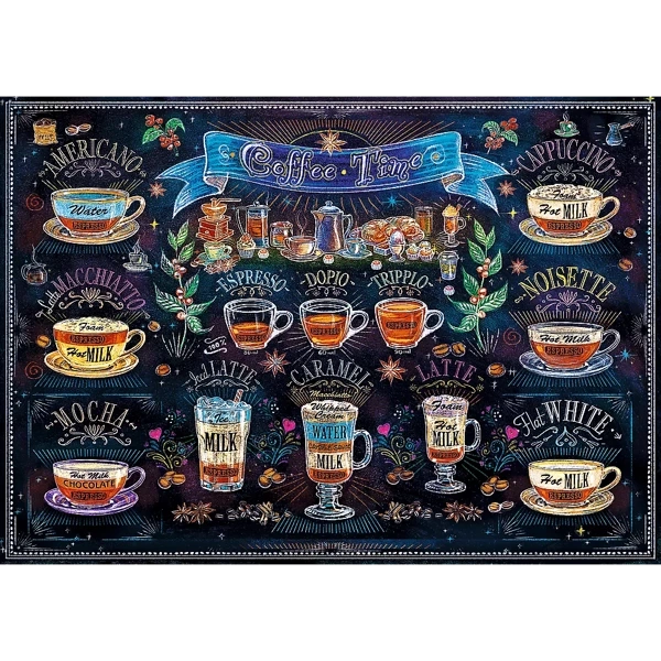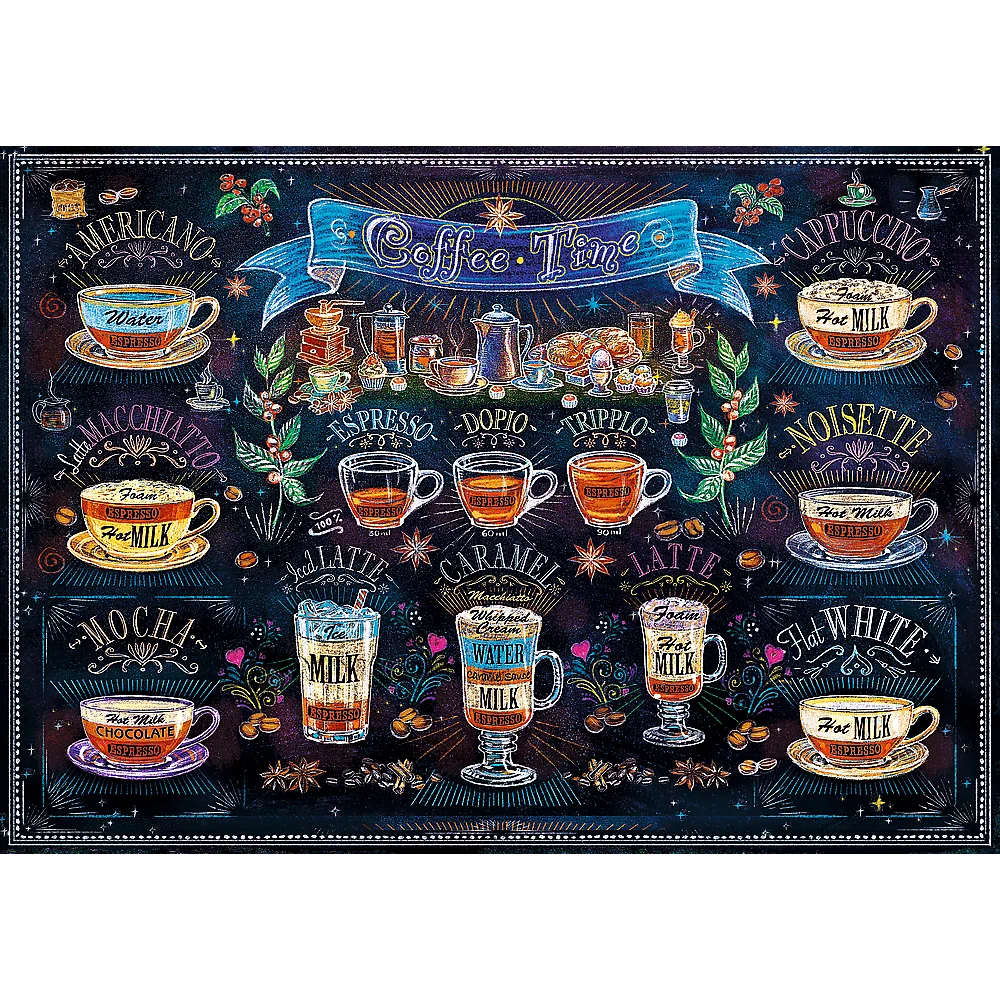 Puzzle składające się z 500 elementów przedstawiające rysunkowy kolaż ze smakowitymi kawami. Po ułożeniu powstanie obrazek o wymiarach 480x340 mm.