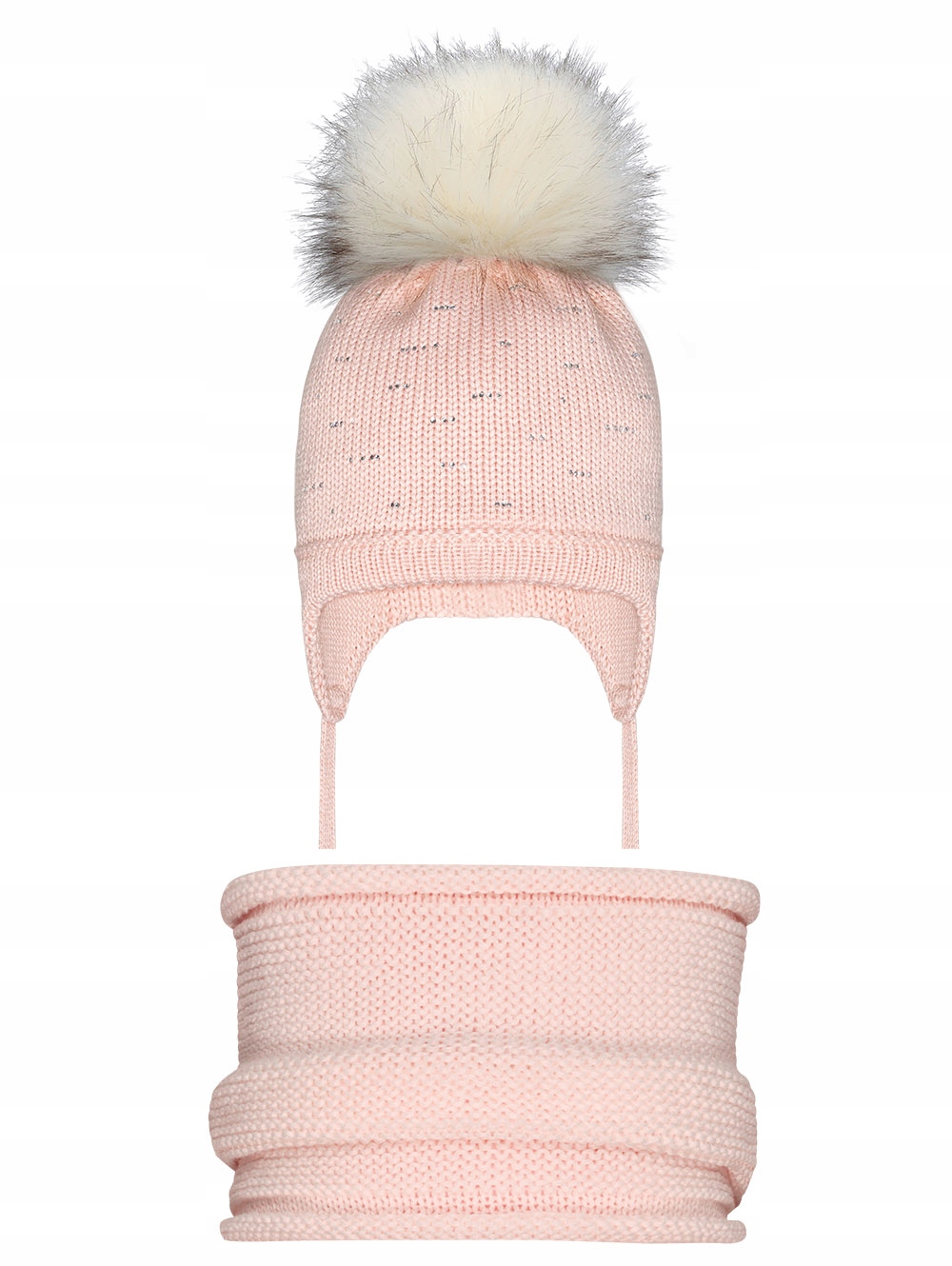 Elegancka czapka zimowa dla Dziewczynki z kryształkami w komplecie z kominem. Uszyliśmy ją z miękkiej wełny z dodatkiem ciepłego akrylu, a podszyliśmy naturalną bawełną. Dobierając rozmiar czapki, wybierz o 1 cm mniejszy niż obwód. Obwód głowy mierzymy na wysokości czoła, za uszami. Czapka posiada pompon ze sztucznego eko futra.