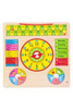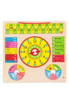 Zegarek posiada ruchome wskazówki dzięki czemu dziecko może uczyć się odpowiednich godzin, posiada uchwyt do powieszenia na ścianie, zegarek w formie tablicy na której znajdują się dodatkowo dni tygodnia, miesiące oraz pory roku w języku angielskim oraz liczby od 1 do 31.