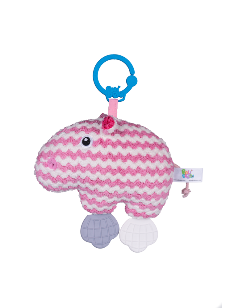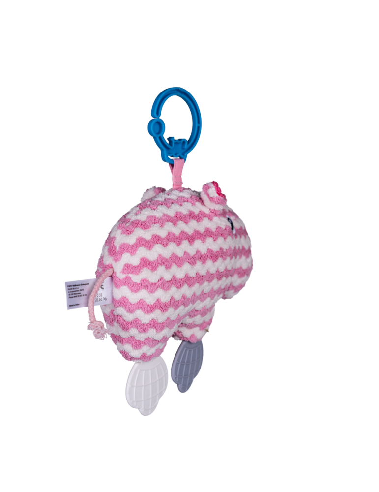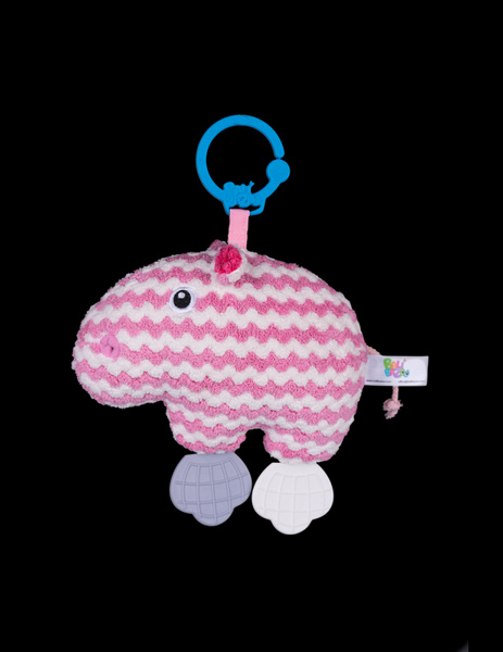 Zawieszka do wózka w pastelowych kolorach posiada gryzaczki oraz dzwoneczek.