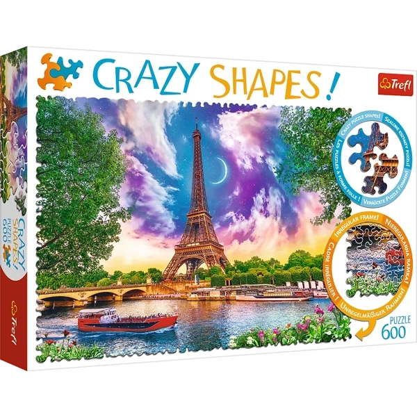 Crazy Shapes! to najbardziej szalona seria puzzli na świecie, w której: puzzle mają zwariowany, niestandardowy kształt, nie ma żadnych prostych linii, krawędź obrazu jest zakręcona i nieregularna. Puzzle składają się z 600 elementów, po ułożeniu powstanie obrazek o wymiarach 680 x 480mm przedstawiający niebo nad Paryżem.