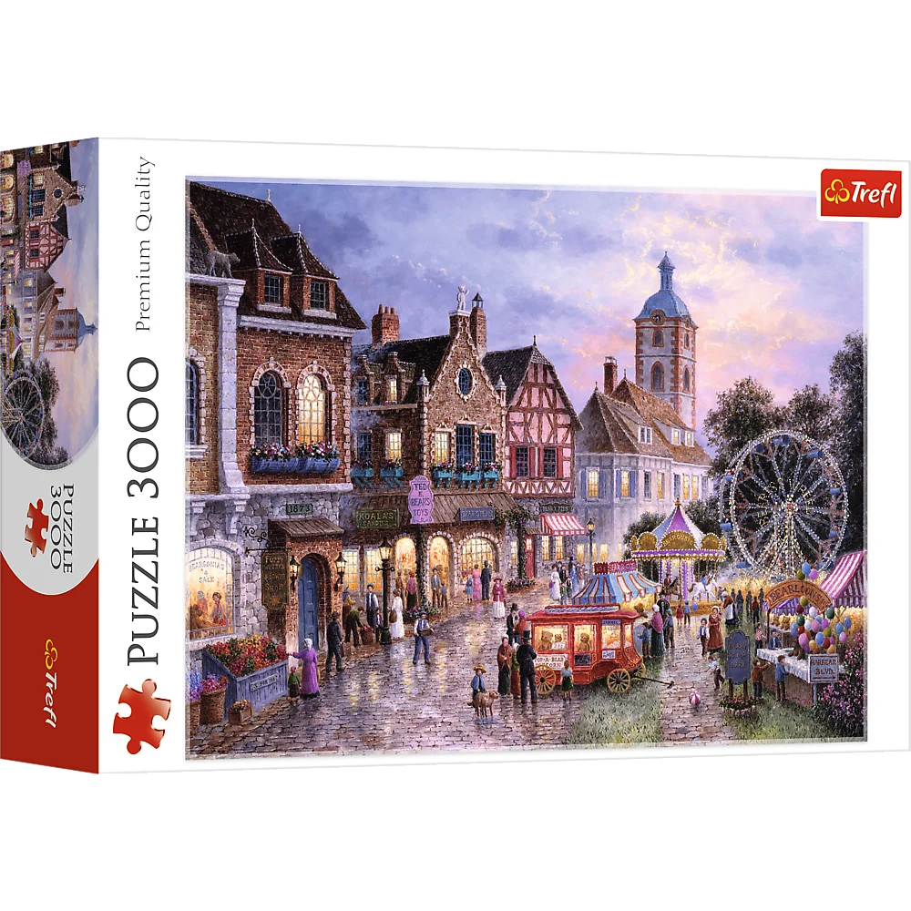 Puzzle 3000 elementów przedstawiające uroczy obrazek wesołego miasteczka z dawnych lat. Po ułożeniu powstanie obrazek o wymiarach 116x85cm.