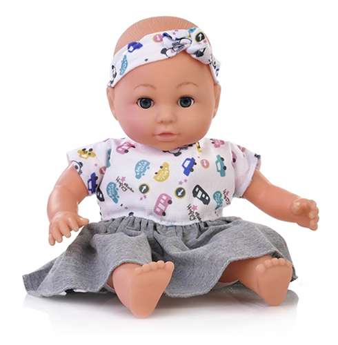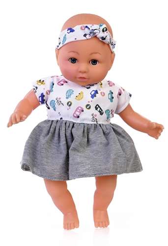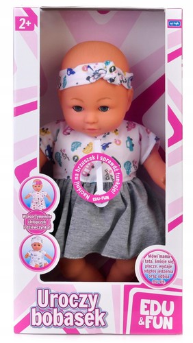 Uroczy bobasek jest ubrany w piękne ubranko. Po naciśnięciu na brzuszek wydaje dźwięki jak prawdziwy dzidziuś.