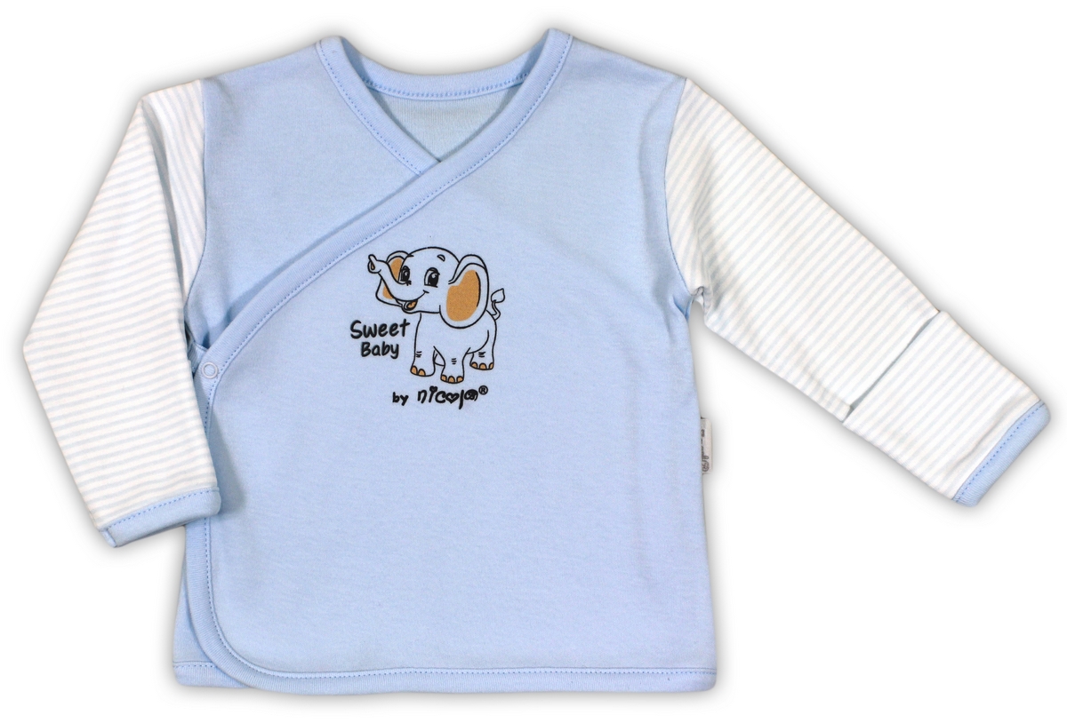 Nicol Koszulka Niemowlęca Długi Rękaw Słonik Rozmiar 52. Bawełniana, przyjemna w dotyku koszulka, uszyta z materiału w kolorze jasnoniebieskim, z dodatkiem bieli. Ubranko posiada zakładany przód,zapinany na wygodne napy oraz praktyczne wywinięcia w rękawach,chroniące maluszka przed zadrapaniem.