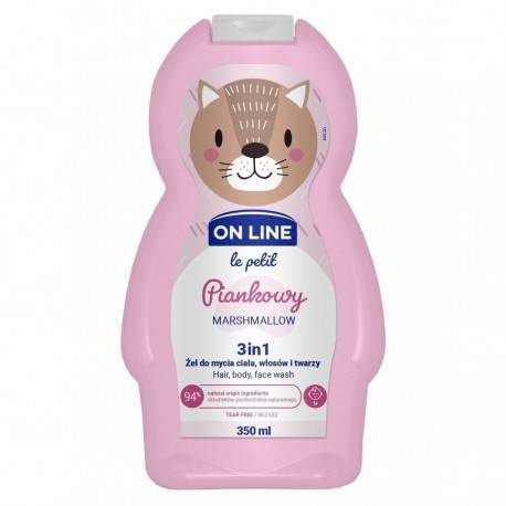 Nawilżający żel 3w1 o zapachu pianki marshmallow. Myje, jednocześnie pielęgnując ciało, włosy i twarz dziecka. Nie szczypie w oczy, ułatwia rozczesywanie włosów po kąpieli i zmniejsza ich elektryzowanie. Produkt przebadany dermatologicznie, zawiera 94% składników pochodzenia naturalnego. Posiada neutralne pH. Może być używany powyżej 1-go roku życia. Odpowiedni do skóry wrażliwej.