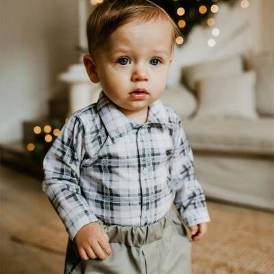 Body z kołnierzykiem w szarą kratkę. Eleganckie body chłopięce idealnie sprawdzą się na święta lub rodzinny obiad. Eleganckie body wykonane są z dzianiny bawełnianej. Dzięki czemu są wygodne dla maluszka. Materiał: 100% bawełna wysokogatunkowa.