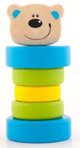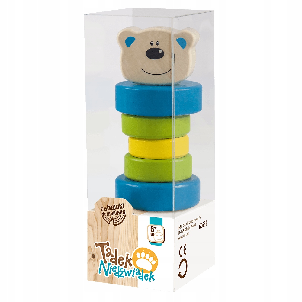 Sympatyczny niedźwiadek wykonany z jasnego, naturalnego drewna jest doskonałą zabawką ogólnorozwojową.