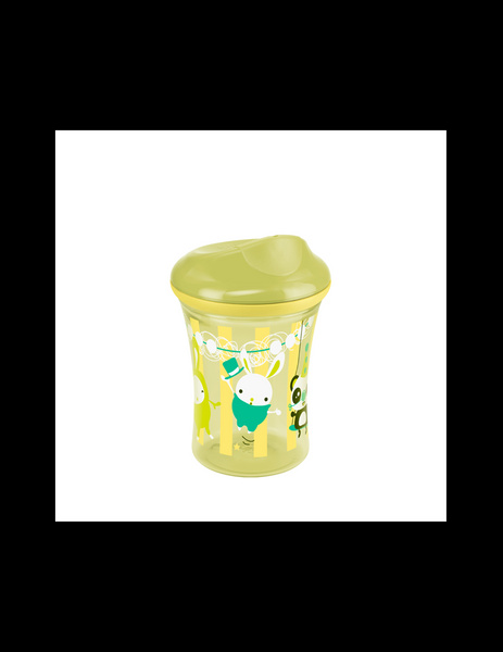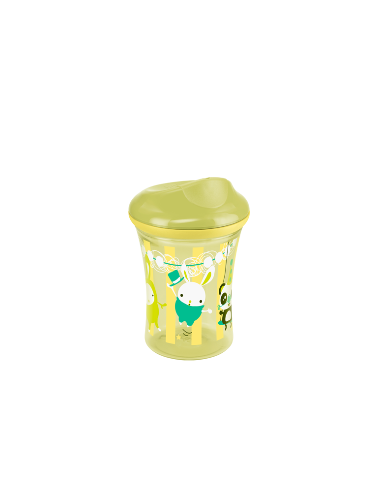 Płaski ustnik umożliwiający picie bez rozlewania przygotowuje dziecko do picia bez ustnika. Obręcz na brzeg umożliwia doskonalenie picia z prawdziwego kubka.