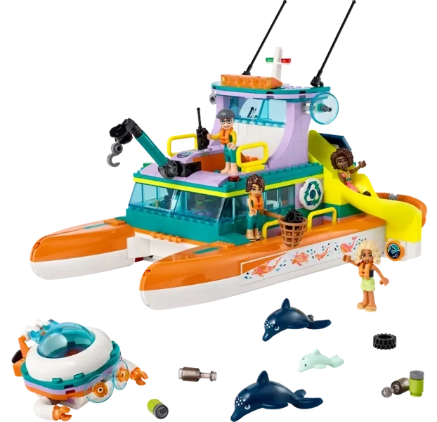 Dzieci, którym zależy na przyrodzie, mogą poznać życie w oceanach dzięki szczegółowemu zestawowi LEGO® Friends Morska łódź ratunkowa dla dzieci w wieku od siedmiu lat. W zestawie znajduje się katamaran do zbudowania, który może służyć jako laboratorium, oraz mała łódź podwodna. Dzieci mogą odgrywać historie o ratownictwie morskim, przepływając łodzią po śmieciach, aby złapać je w sieci i przekazać do recyklingu. Nova i Aliya nie sądziły, że mają ze sobą wiele wspólnego, ale stają się sobie bliższe, podejmując tę wspólną misję.