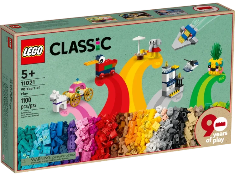 Dzieci, dorośli i dziadkowie mogą czerpać radość podczas wielogodzinnej, nostalgicznej zabawy zestawem LEGO® Classic 90 lat zabawy (11021). Zestaw ten stanowi hołd dla kreatywnej frajdy minionych czasów — zawiera wiele różnokolorowych klocków LEGO, 15 minimodeli stanowiących repliki słynnych zestawów LEGO z poprzednich lat oraz dodatkowe klocki do swobodnego budowania.